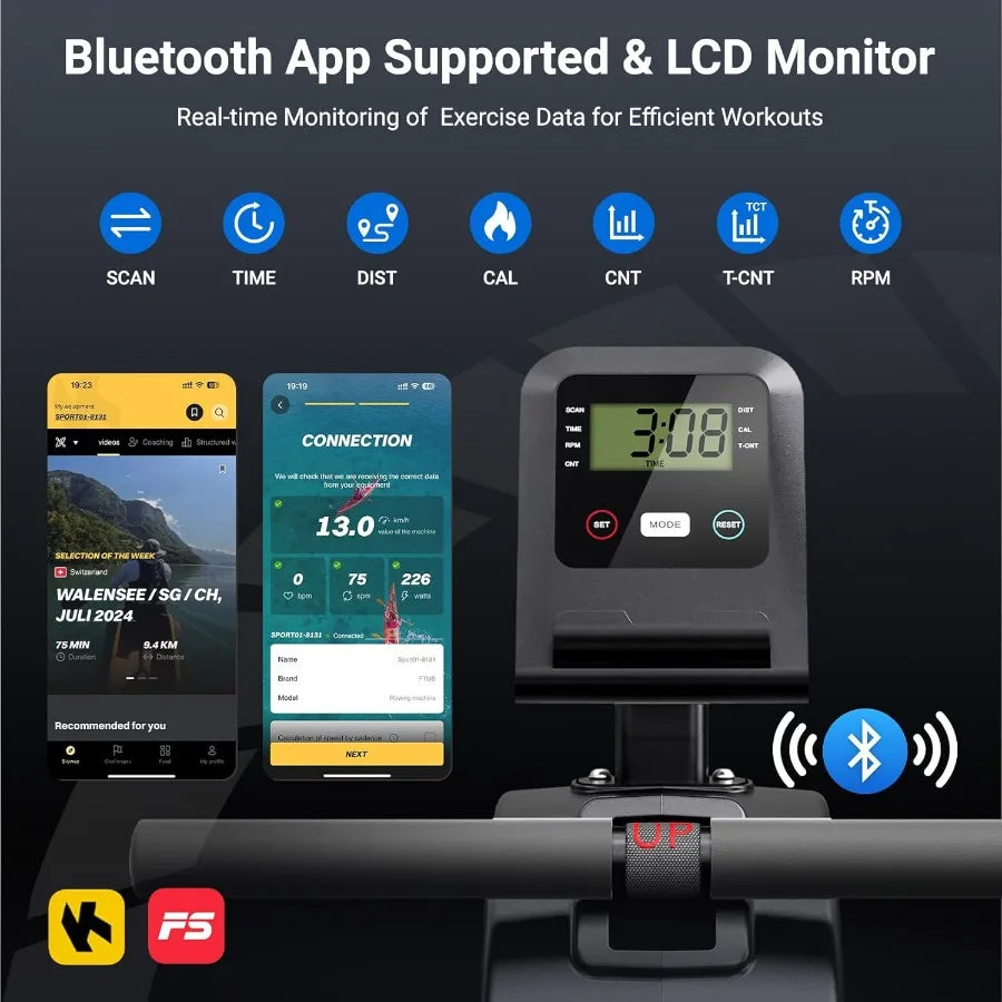 - App Compatible & LCD Monitor: You can connect your smartphone or device to the rowing machine via Bluetooth, track your exercise metrics during your row, and immerse yourself in a variety of live training videos to complete passionate exercise challenges. Besides, the digital monitor accurately records every achievement, including scan, distance, time, calories, count and total count