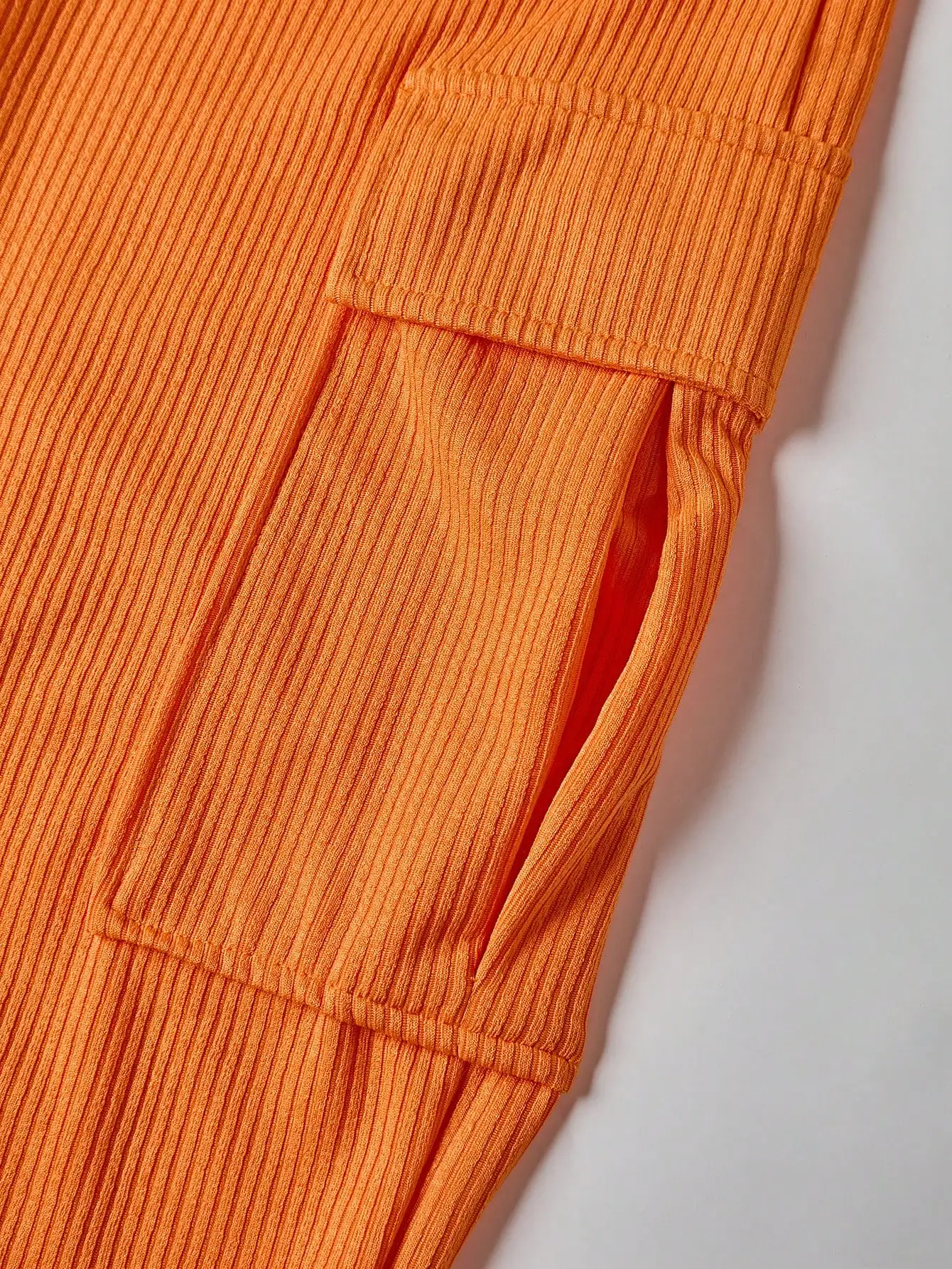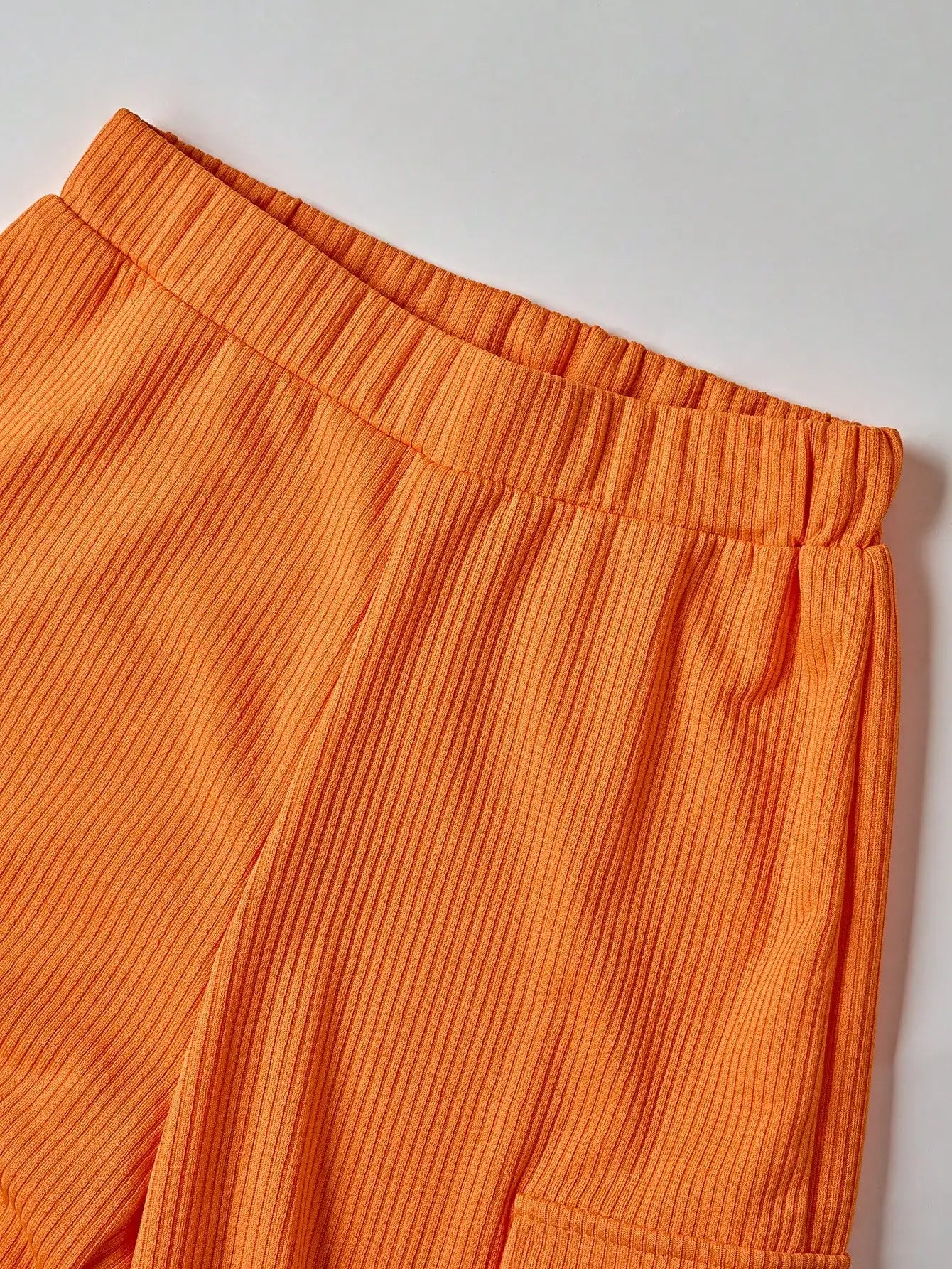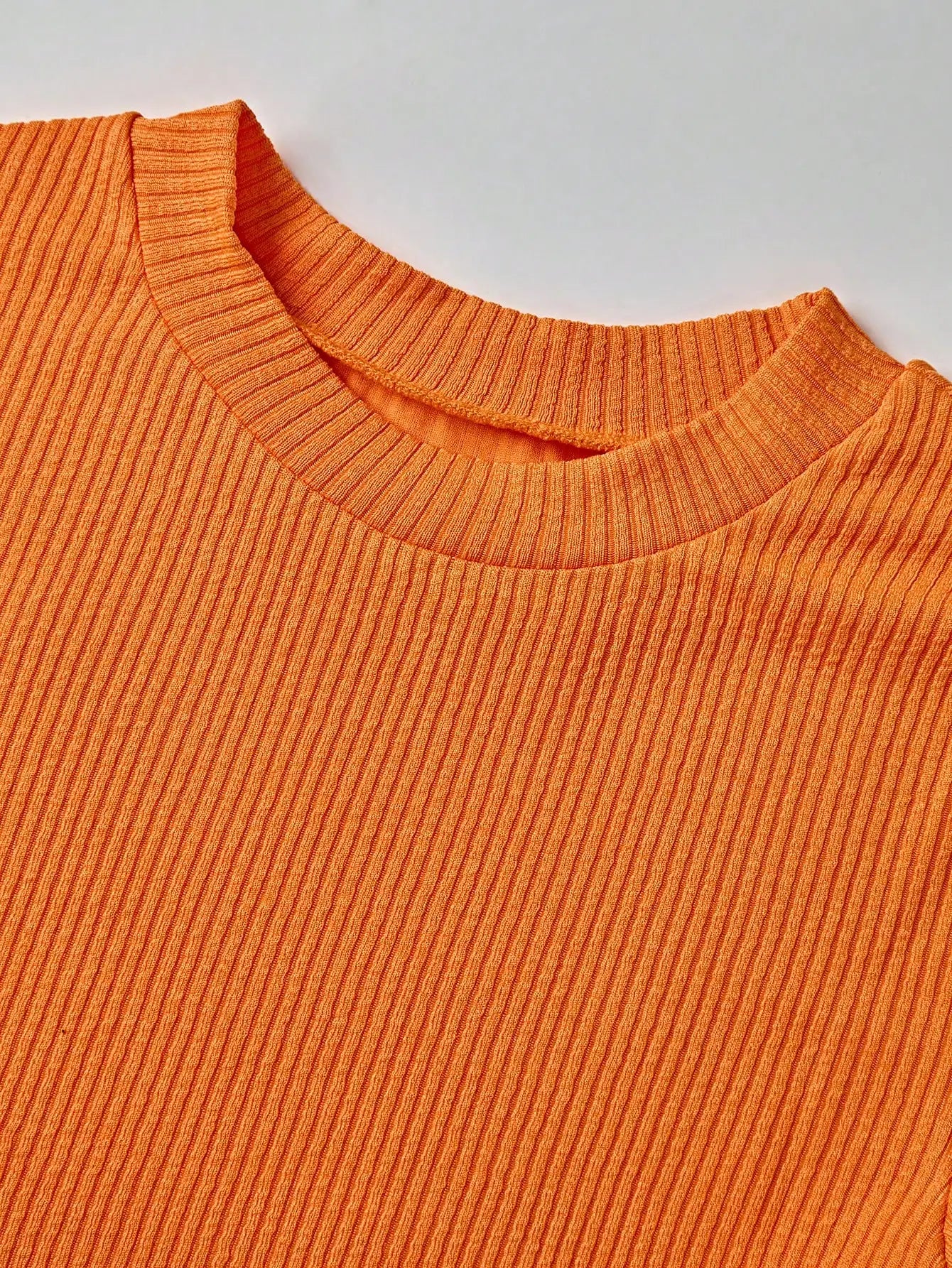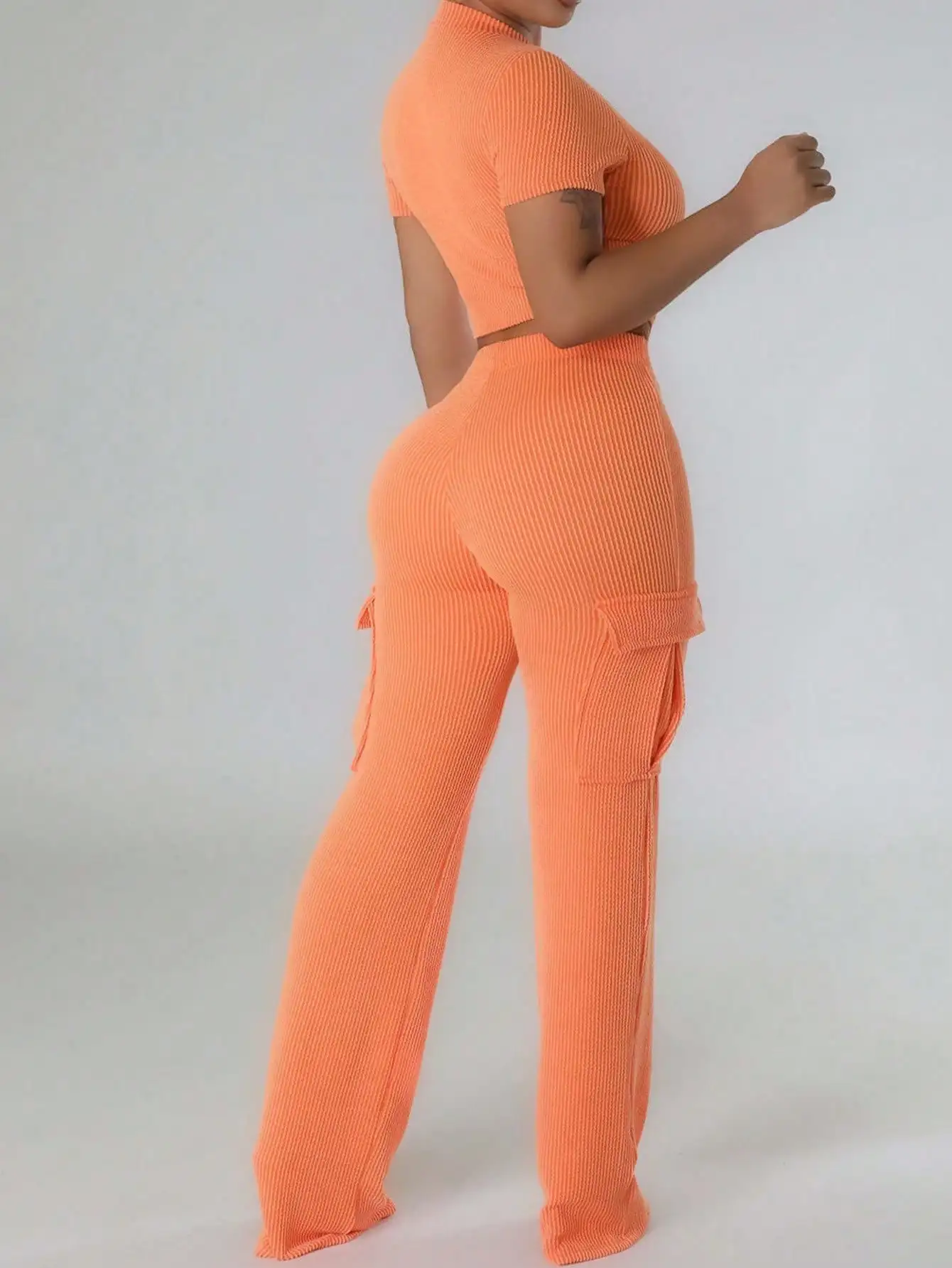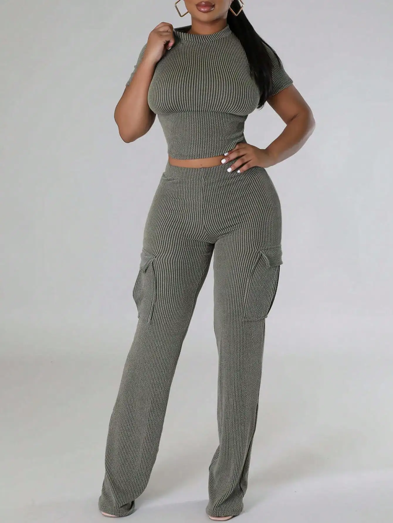 Women's Ribbed Two-Piece Tracksuit Set - Short Sleeve Crop Top & High Waisted Wide Leg Pants - Casual Sporty Outfit for Gym